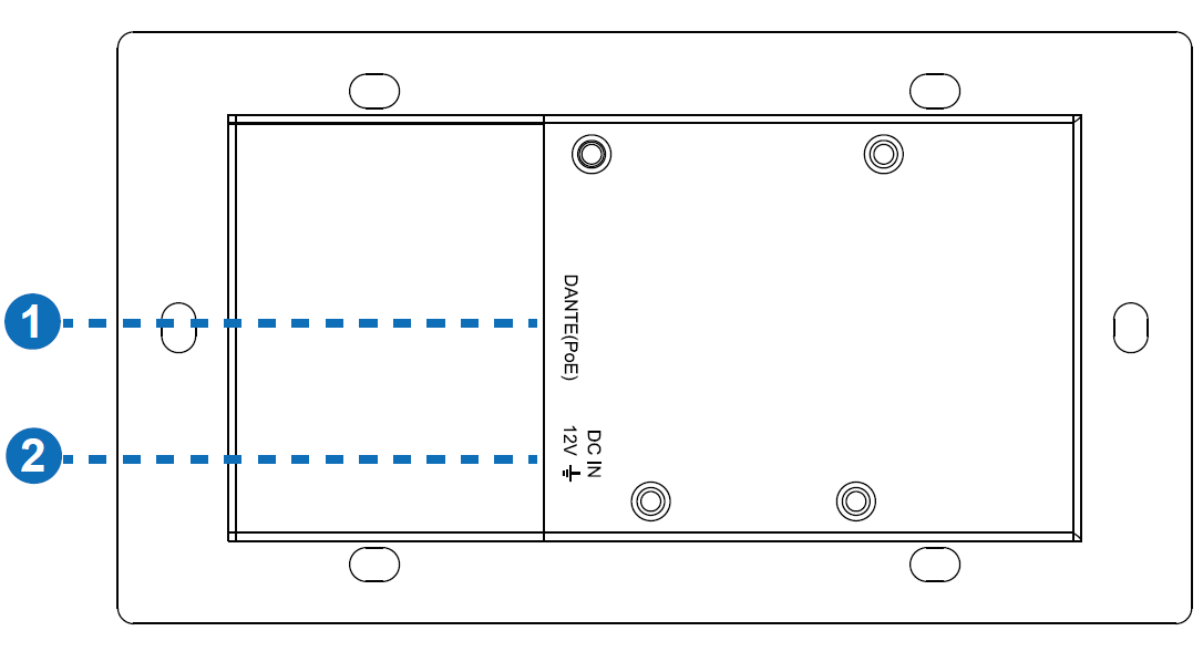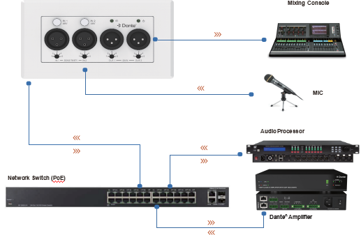 100M Dante® digital audio input/output port, forbundet til netværksswitchen via RJ45 linje, understøtter PD strømforsyning.